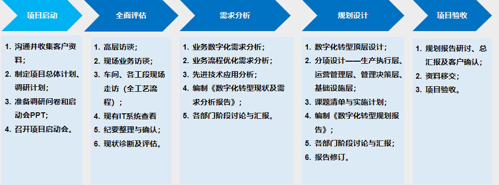 “四步曲”将数字化规划分为四个步骤:现状评估及调研、数字化需求分析、数字化顶层规划与分项设计、数字化规划实施落地。