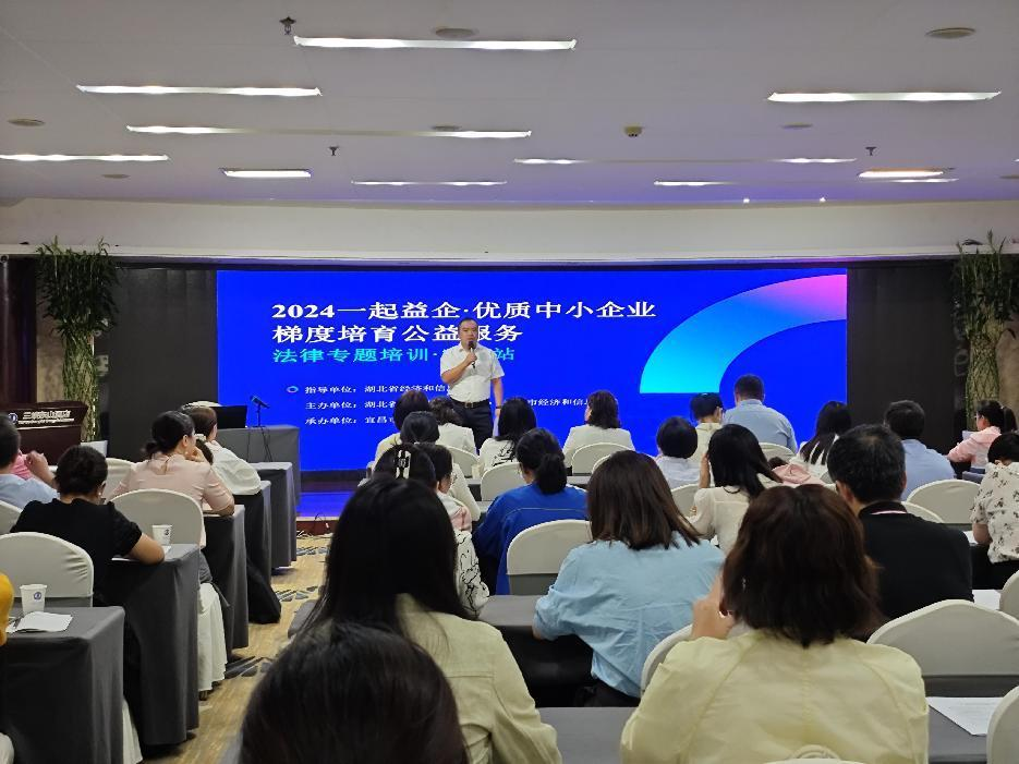 2024年9月27日,由湖北省经济和信息化厅指导,湖北省中小企业服务中心、宜昌市经信局主办,宜昌市中小企业服务中心承办的“2024一起益企·优质中小企业梯度培育公益服务”法律专题培训活动在宜昌顺利举行。省中小企业服务中心主任李承绘、宜昌市经信局党组成员吴周玉现场致辞,省经信厅政策法规处、宜昌市经信局、宜昌市中小企业服务中心及当地中小企业人力资源与劳动人事负责人等近100余人参加培训活动。